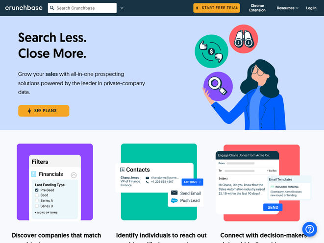 - Unternehmensinformationen: Crunchbase ist eine führende Quelle für Informationen über Unternehmen, von Start-ups in der Frühphase bis zu den Fortune 1000 Unternehmen. Es bietet Einblicke in den Wettbewerb, ermöglicht die Entdeckung von Start-up-Trends und liefert Daten zur Unternehmensfinanzierung. Damit können Nutzer neue Aussichten erkunden, Konkurrenten überholen und Quoten übertreffen.